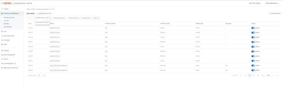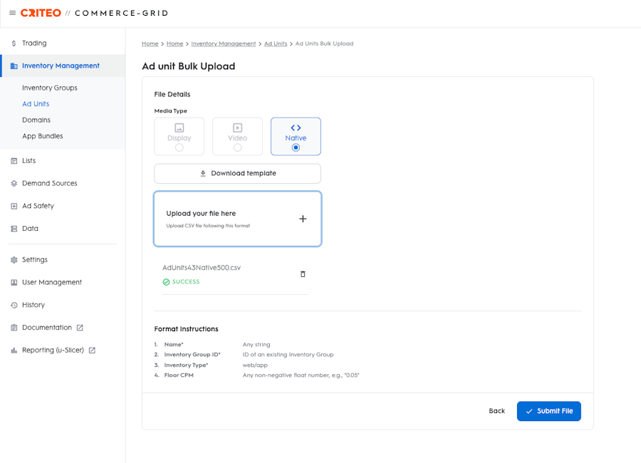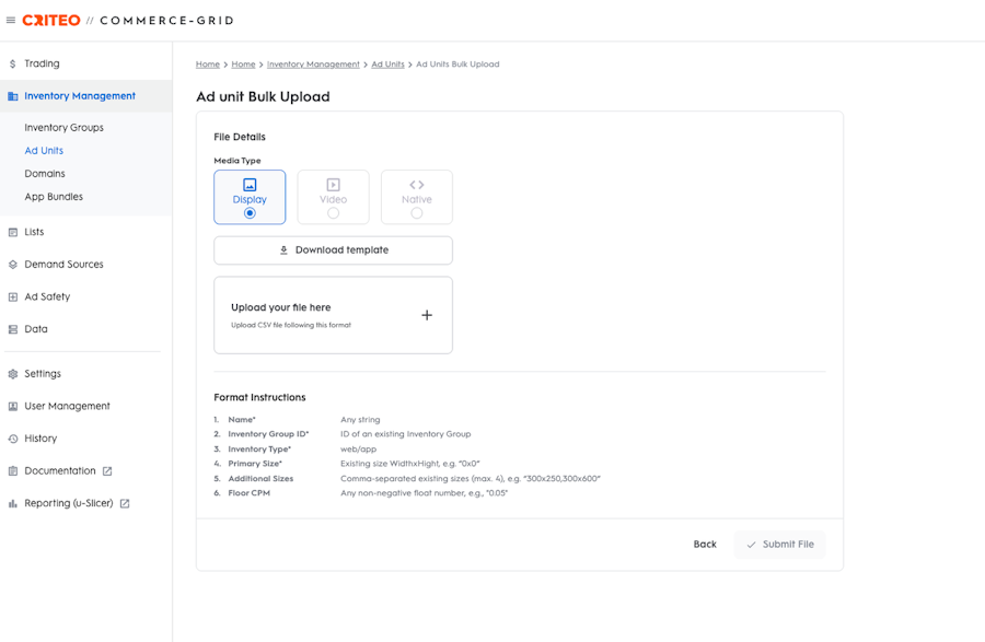 To help clients onboard faster and manage inventory more efficiently, Commerce Grid now supports bulk uploading of ad units via CSV files. This feature is available directly within the platform and is ideal for accounts with large numbers of ad units (e.g., display, video, or native formats).