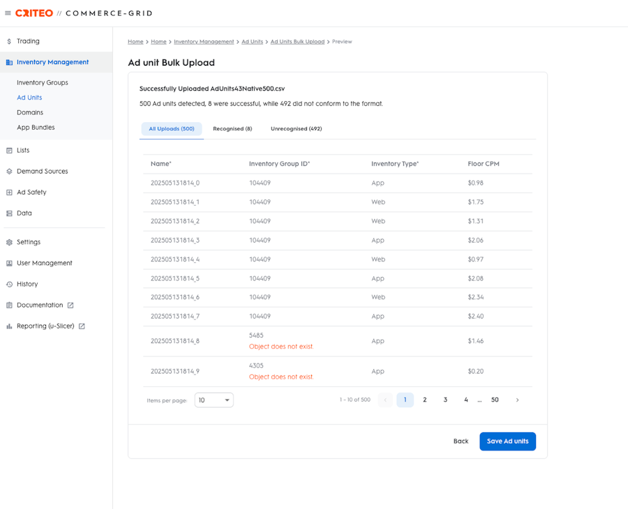 With a few simple steps, you can upload and validate up to 500 ad units at once — no need to rely on manual entry or support tickets.