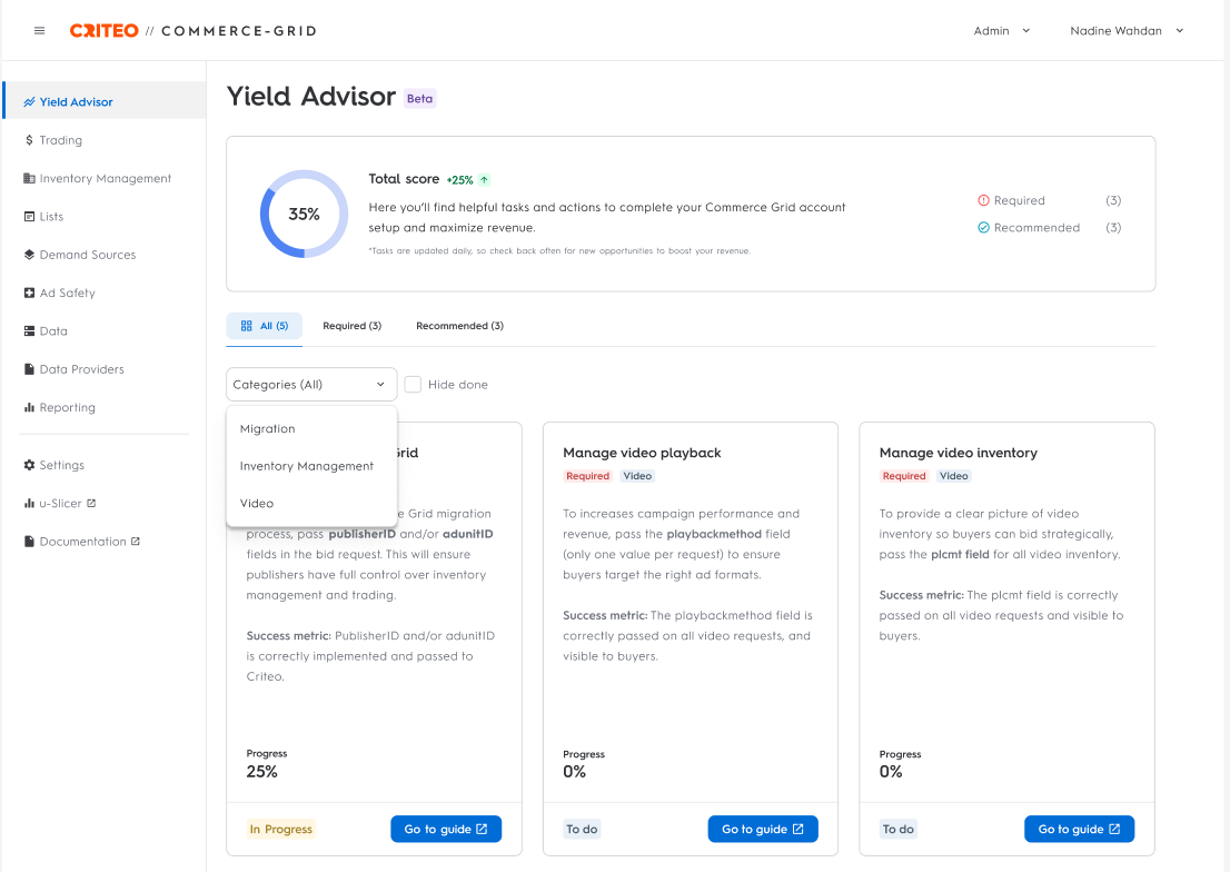The Yield Advisor is a self-service dashboard within Commerce Grid that surfaces key optimizations related to integration health, account setup, and demand readiness. It enables publishers to identify issues and uncover monetization opportunities without relying on manual support or guesswork.