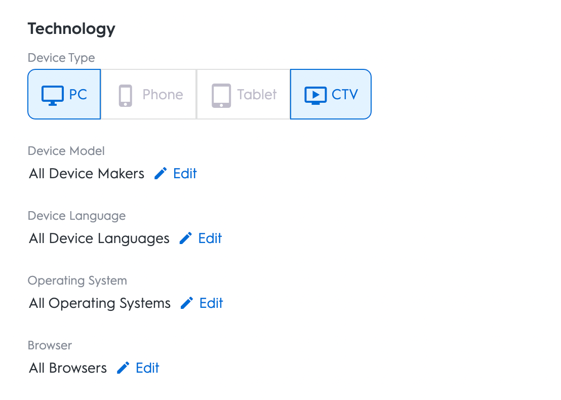 • Device Type: The device your traffic uses to access your inventory (PC, Phone, Tablet, CTV). Please note that the inventory selections you made earlier superscede your device settings.