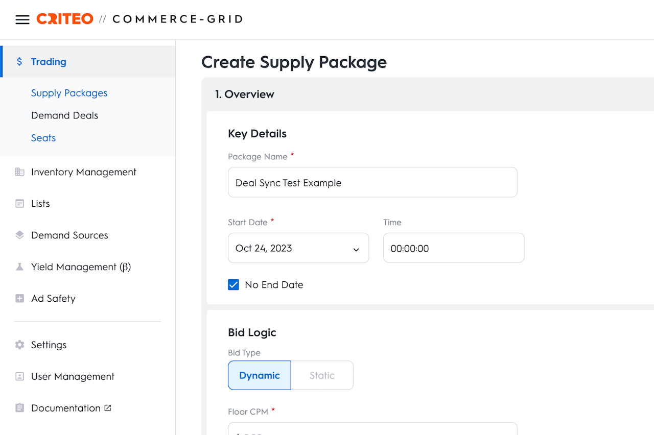 A publisher working in Commerce Grid creates a Supply Package and subsequent Demand Deal and then selects a Deal Sync-enabled DSP for distribution which automatically triggers the Deal Sync process.