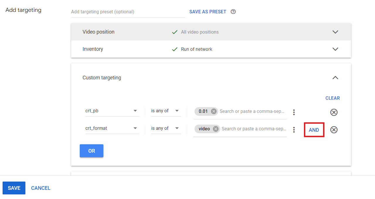 Select the inventory for the campaign and add a Custom targeting crt_pb with the same value that we put in the Rate field, i.e. 0.01. Please always use two decimals within the custom targeting as Google Ad Manager handles them as Strings and not real numbers. Add additional targeting to crt_format is any of video. Make sure to use the AND relation, not OR.