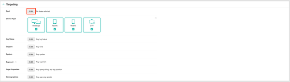 Select Specific Deals. To target specific deals, select one of the following targeting options and complete the corresponding steps. Next, go to the Targeting section and click the Edit button next to Deals.