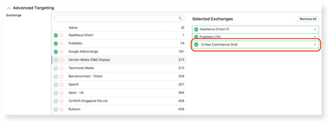 Expand the Advanced Targeting subsection to select Criteo Commerce Grid as a selected exchange.